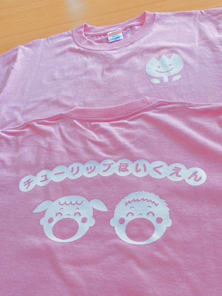 子供達が先生を見つけやすいように、とのご希望でTシャツの色は可愛らしいピンクでフロント左胸部分にはチューリップのイラスト、バック上部には保育園名と男の子&女の子のイラストをデザインしました♪